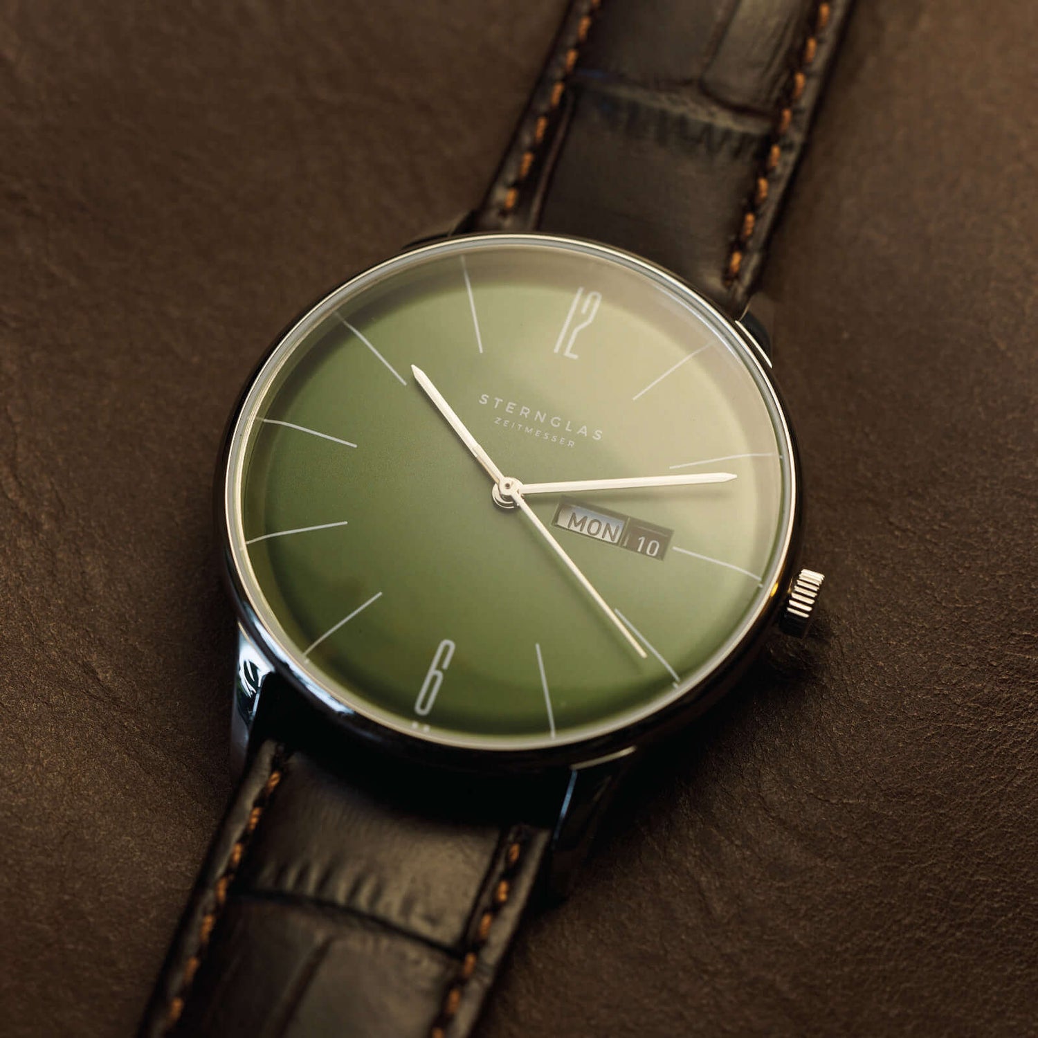 The cowhide leather strap with alligator embossing perfectly showcases the watch face on any wrist. The leather strap comes from a Bavarian manufacturing company.