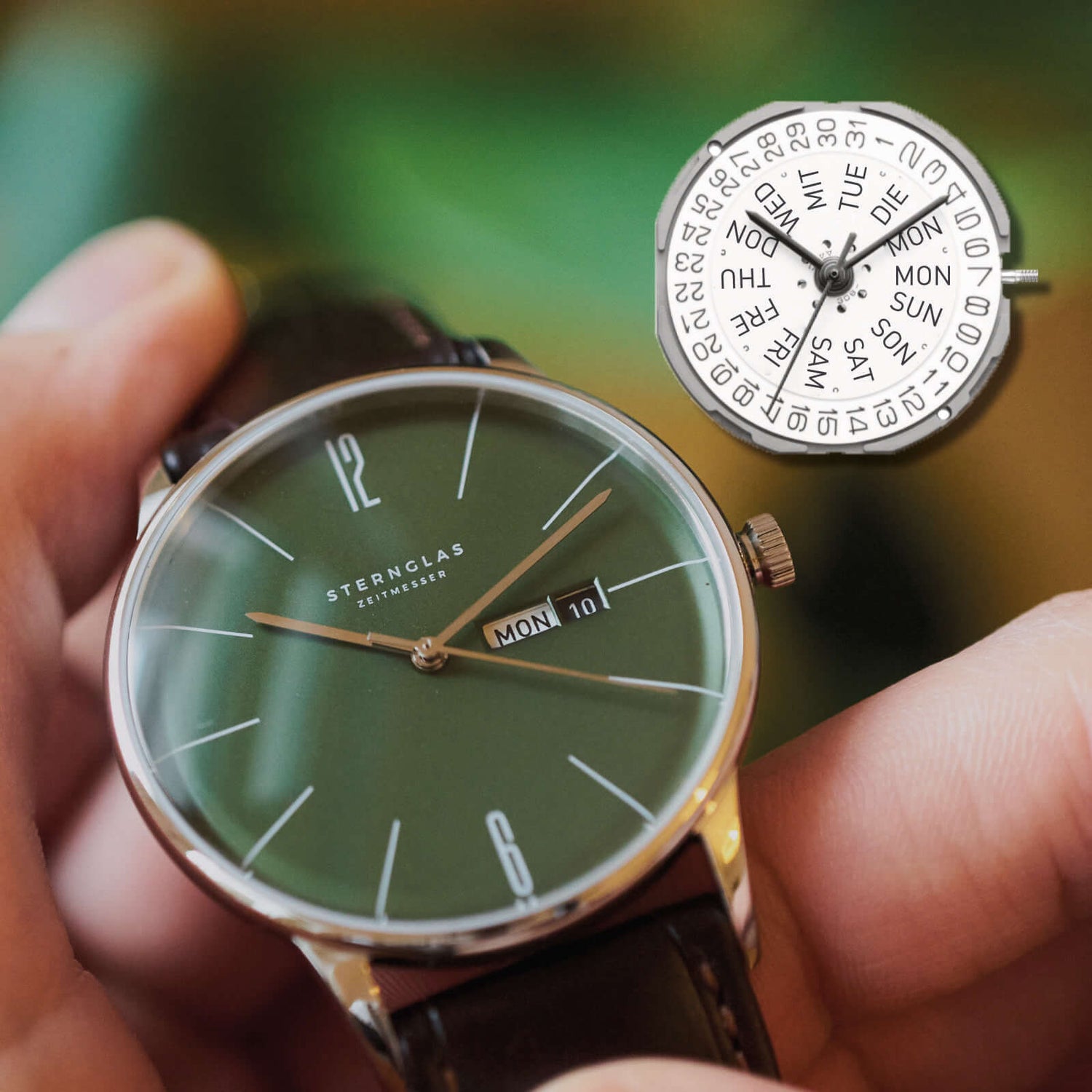 The movement offers a battery life of up to 36 months and a rate accuracy of -20/ +20 seconds per month. In addition to the date, the movement also has a day of the week display in German and English.